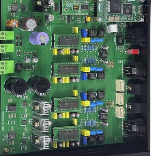 Na zdjęciu zielona płyta główna podłączona, na jej pokładzie zamontowany filtr cyfrowy DF1704E, u góry luzem scalak NOS z 8 chipami. Na pokładzie 4 inne, mniejsze wzmacniacze operacyjne niż w czarnej wersji gdzie są AD.